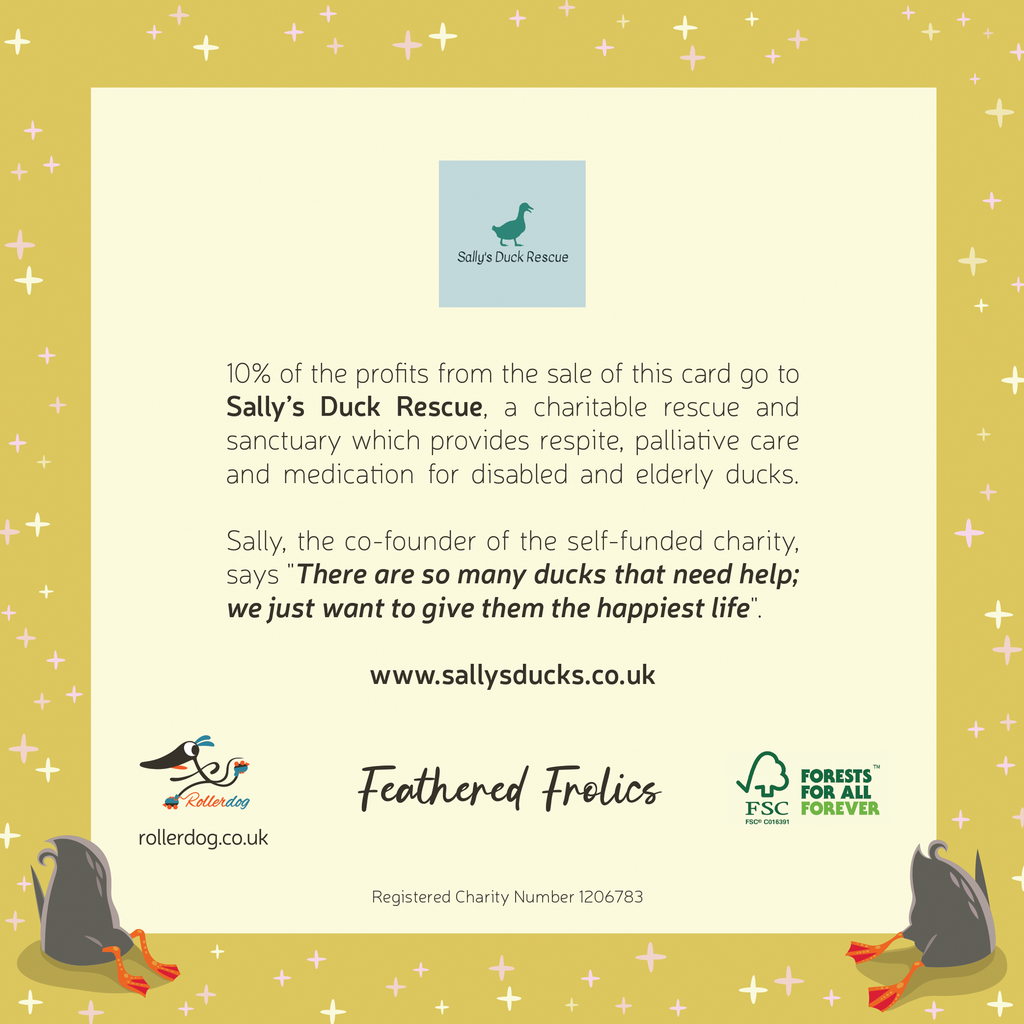 10% of the profits go to Sally's Duck Rescue, a charitable rescue and sanctuary which provides respite, palliative care and medication for disabled and elderly ducks. Find out more about their fabulous work at www.sallysducks.co.uk.